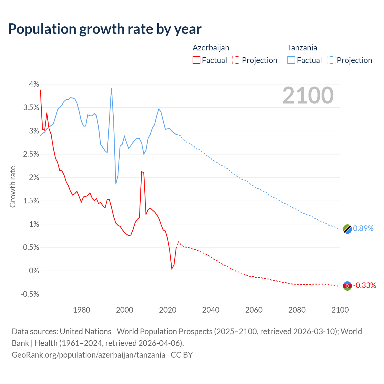 - For the last 10 years, Azerbaijan has had an average growth rate of +0.73% per year vs +3.13% in Tanzania.