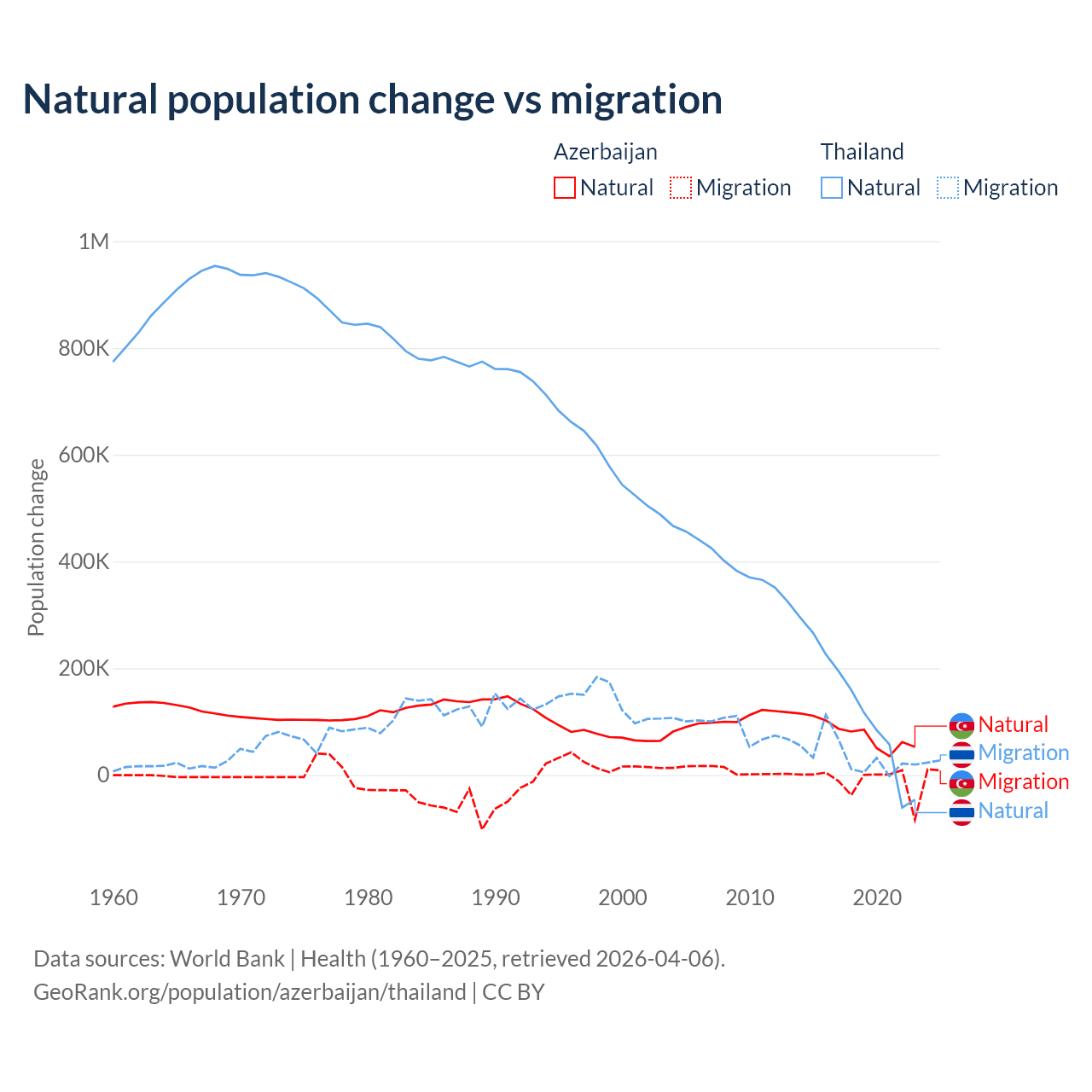 Over the last 10 years, 87.2% of the population change in Azerbaijan is from natural causes (a gain of 782,840 people) and 12.8% is from migration (a loss of 114,572 people). In Thailand 78.4% is from natural causes (a gain of 1,292,528 people) and 21.6% is from migration (a gain of 355,361 people).