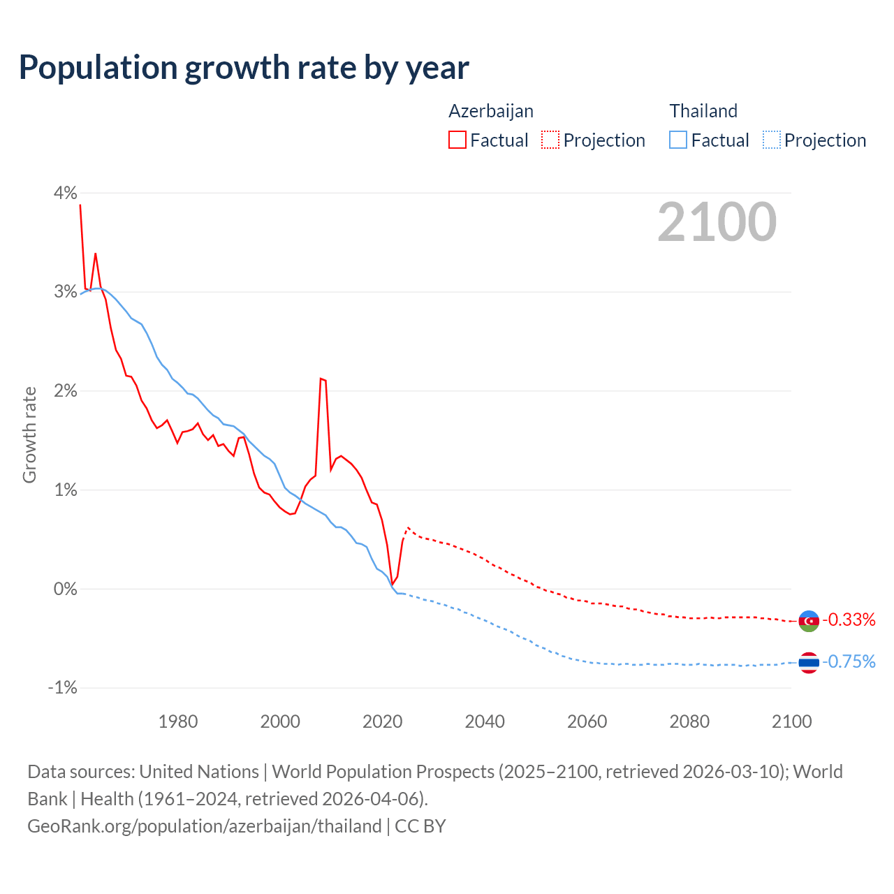 - For the last 10 years, Azerbaijan has had an average growth rate of +0.73% per year vs +0.23% in Thailand.