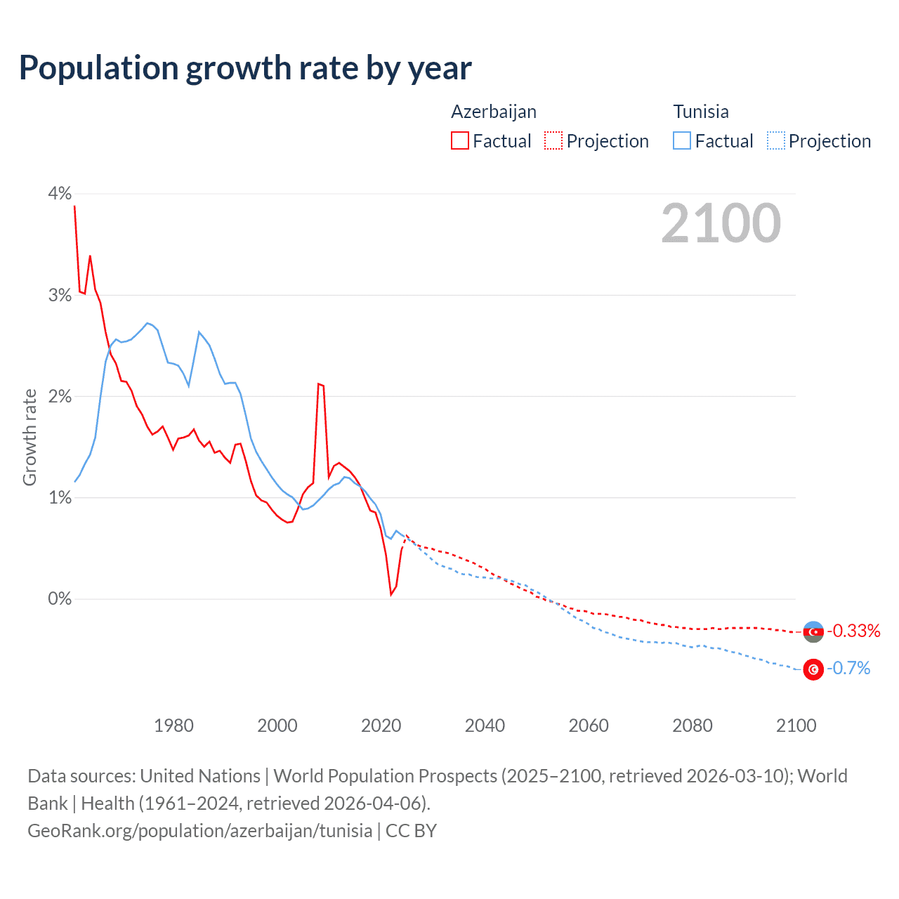 - For the last 10 years, Azerbaijan has had an average growth rate of +0.73% per year vs +0.89% in Tunisia.