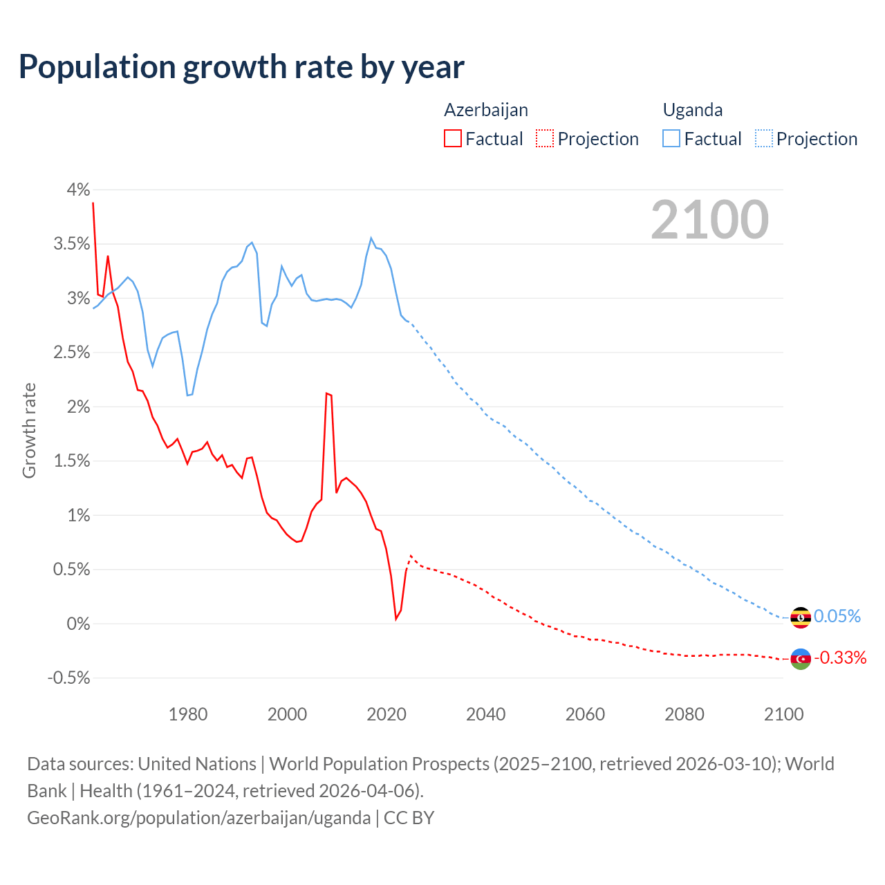 - For the last 10 years, Azerbaijan has had an average growth rate of +0.73% per year vs +3.21% in Uganda.