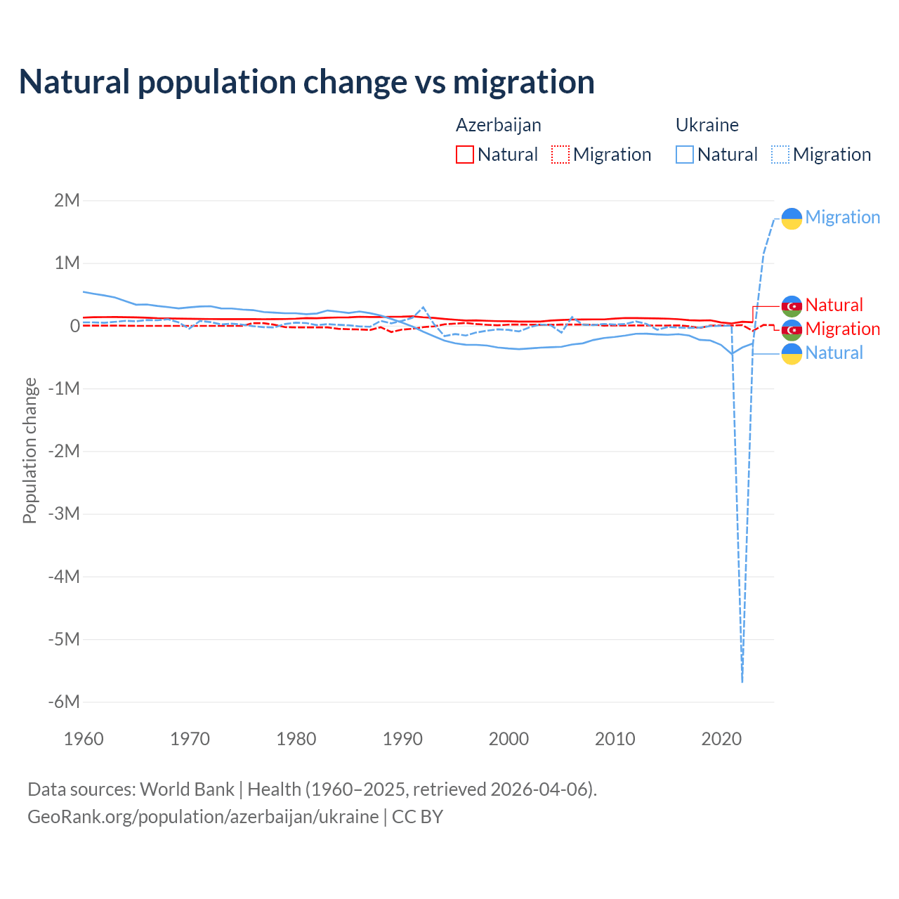 Over the last 10 years, 87.2% of the population change in Azerbaijan is from natural causes (a gain of 782,840 people) and 12.8% is from migration (a loss of 114,572 people). In Ukraine 28.2% is from natural causes (a loss of 2,435,153 people) and 71.8% is from migration (a loss of 6,198,995 people).