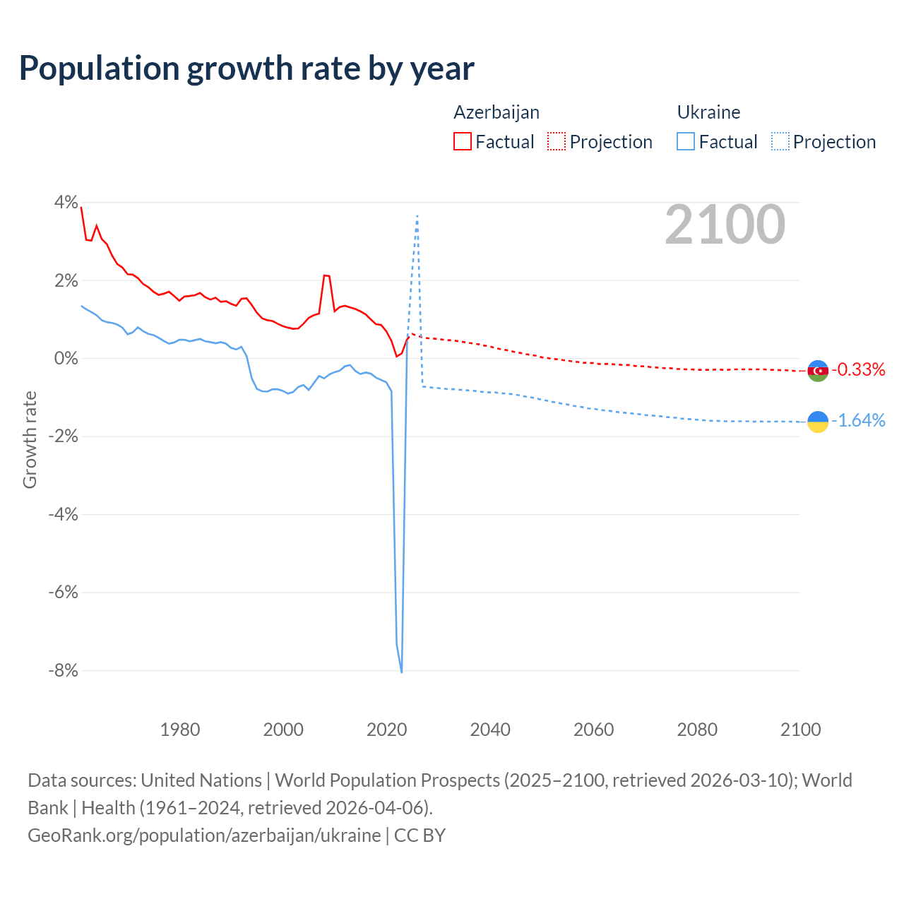- For the last 10 years, Azerbaijan has had an average growth rate of +0.73% per year vs -1.74% in Ukraine.