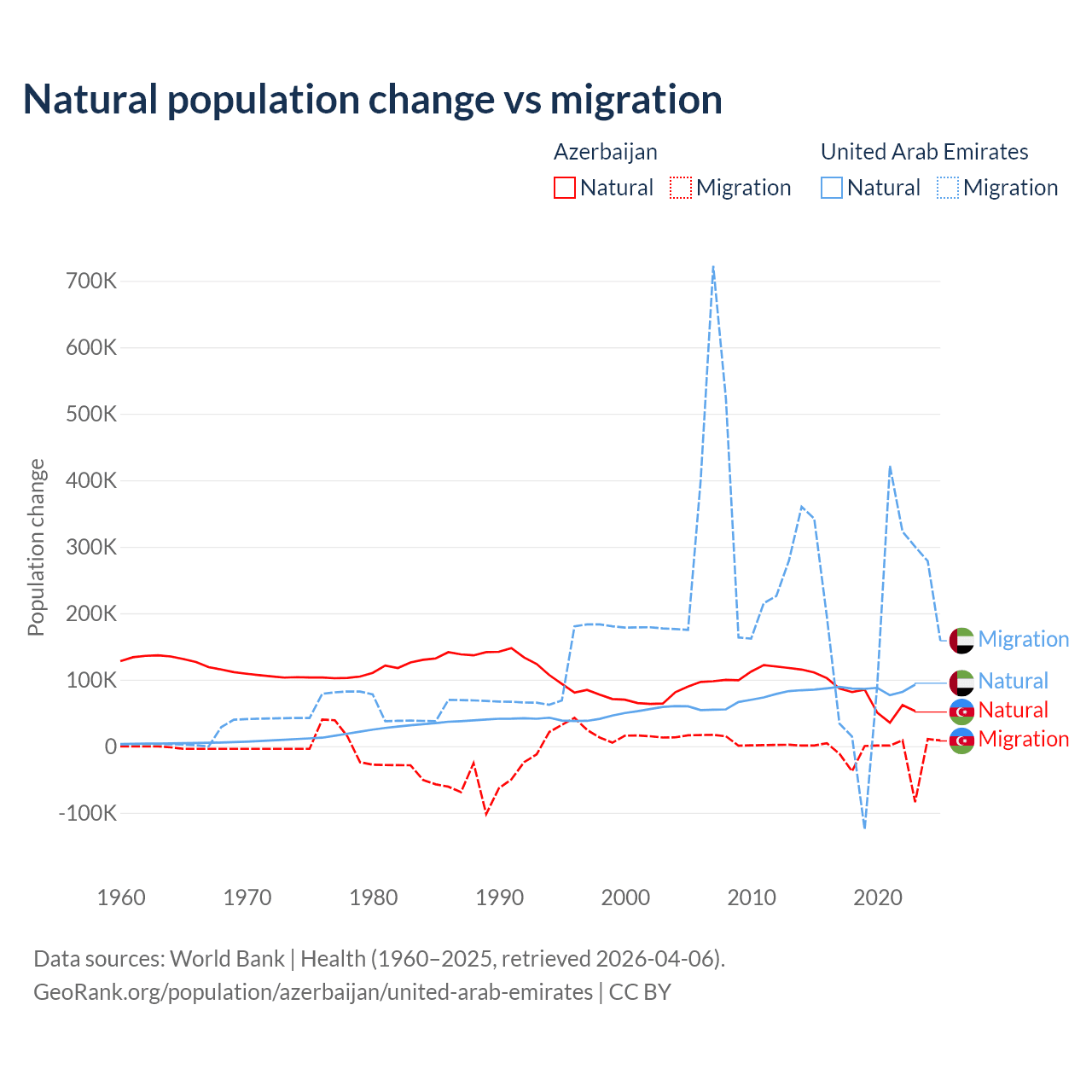 Over the last 10 years, 87.2% of the population change in Azerbaijan is from natural causes (a gain of 782,840 people) and 12.8% is from migration (a loss of 114,572 people). In the United Arab Emirates 30.5% is from natural causes (a gain of 857,996 people) and 69.5% is from migration (a gain of 1,958,520 people).