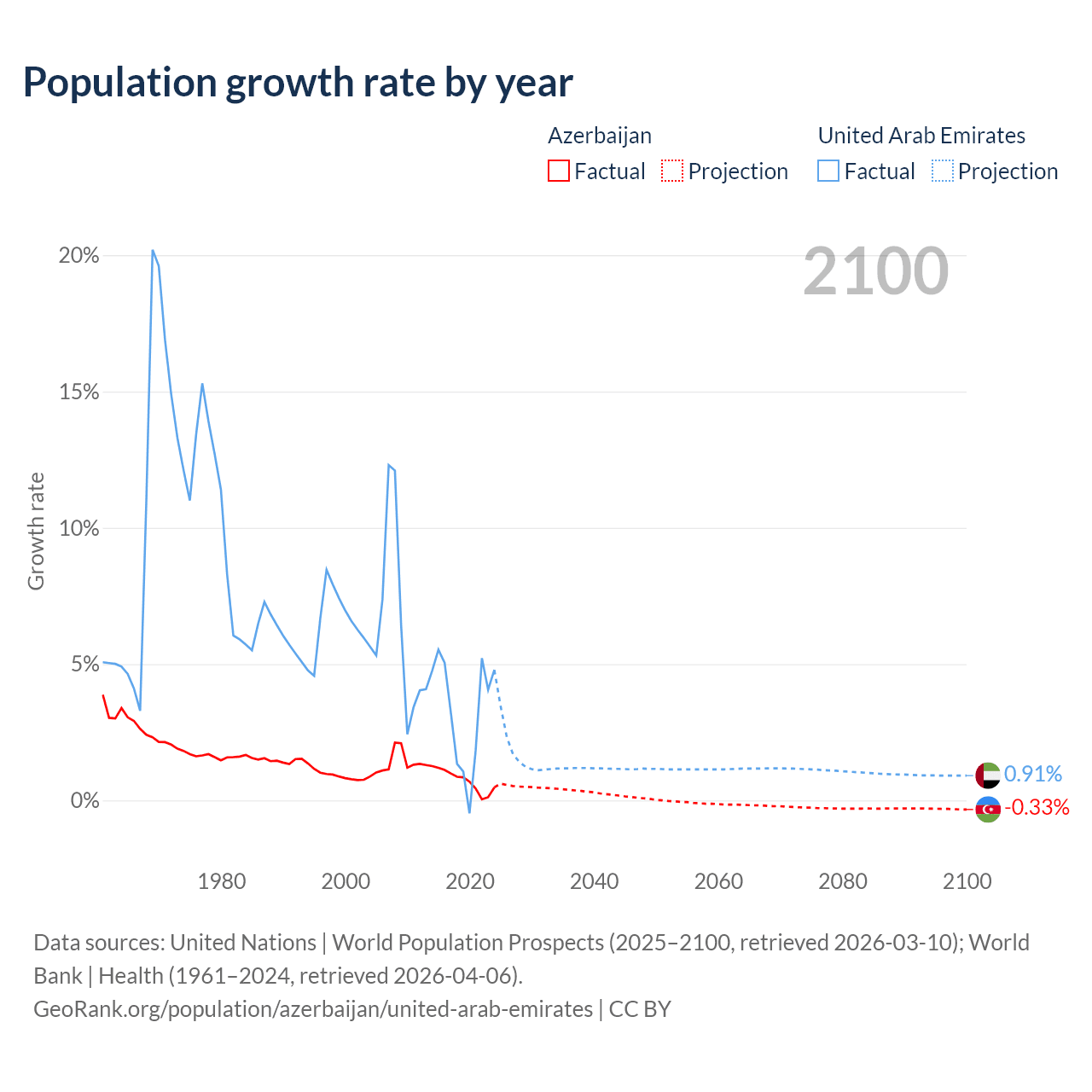 - For the last 10 years, Azerbaijan has had an average growth rate of +0.73% per year vs +3.31% in the United Arab Emirates.