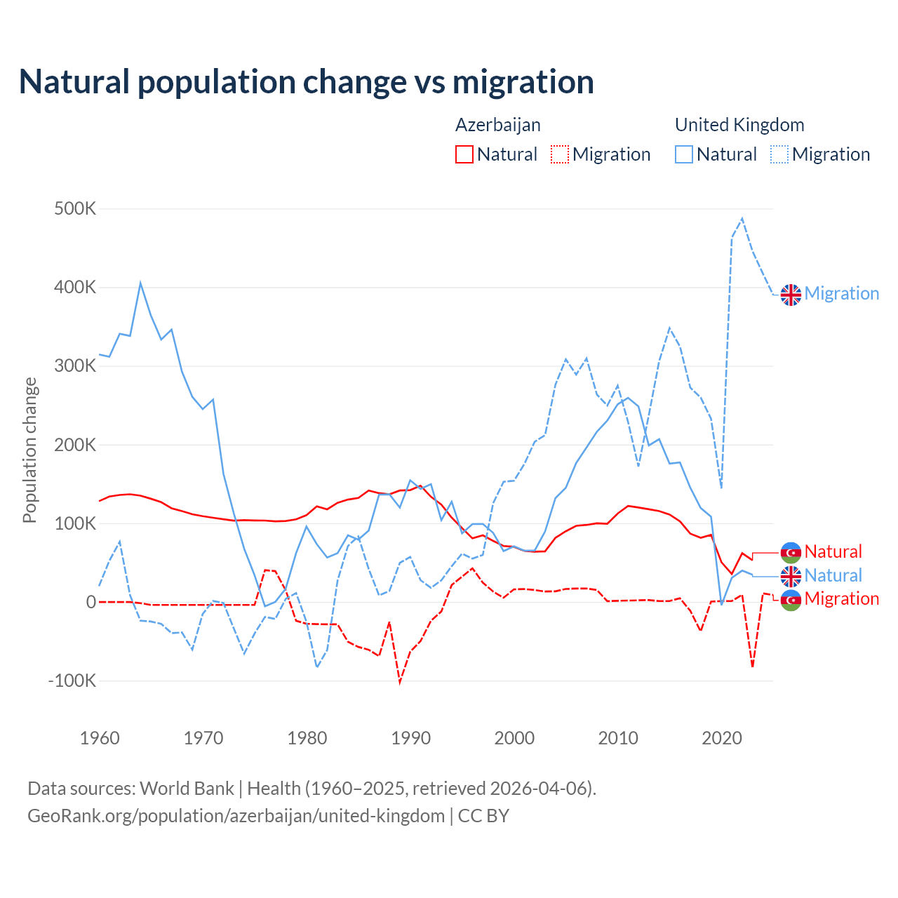 Over the last 10 years, 87.2% of the population change in Azerbaijan is from natural causes (a gain of 782,840 people) and 12.8% is from migration (a loss of 114,572 people). In the United Kingdom 23.9% is from natural causes (a gain of 1,033,129 people) and 76.1% is from migration (a gain of 3,283,101 people).