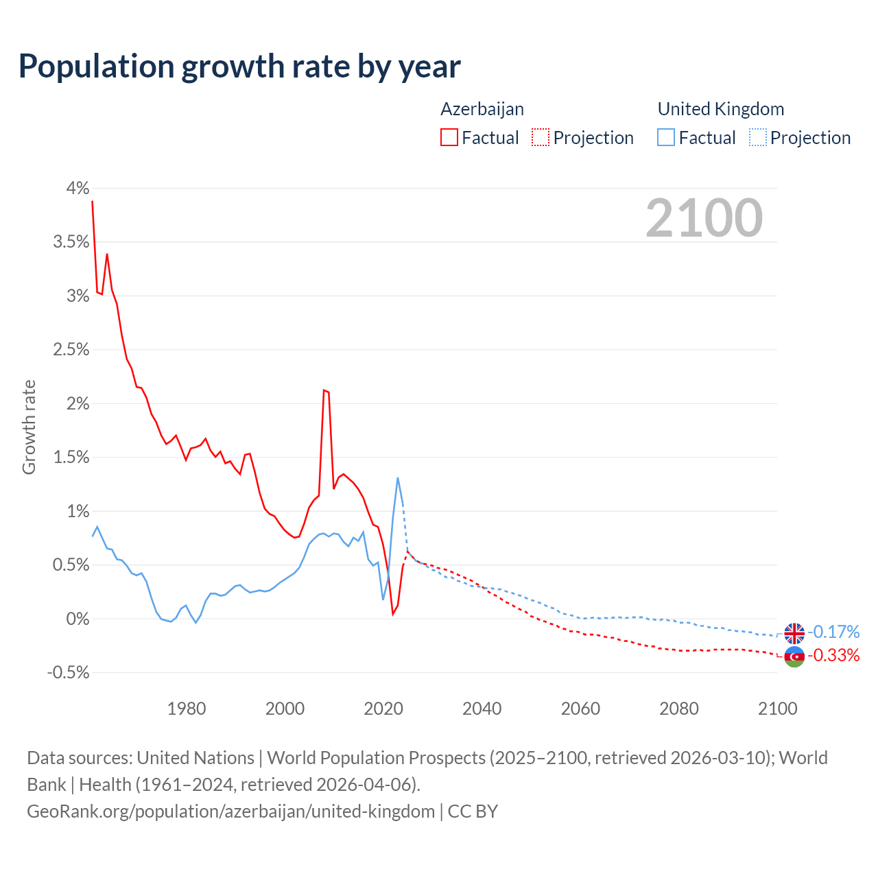 - For the last 10 years, Azerbaijan has had an average growth rate of +0.73% per year vs +0.7% in the United Kingdom.
