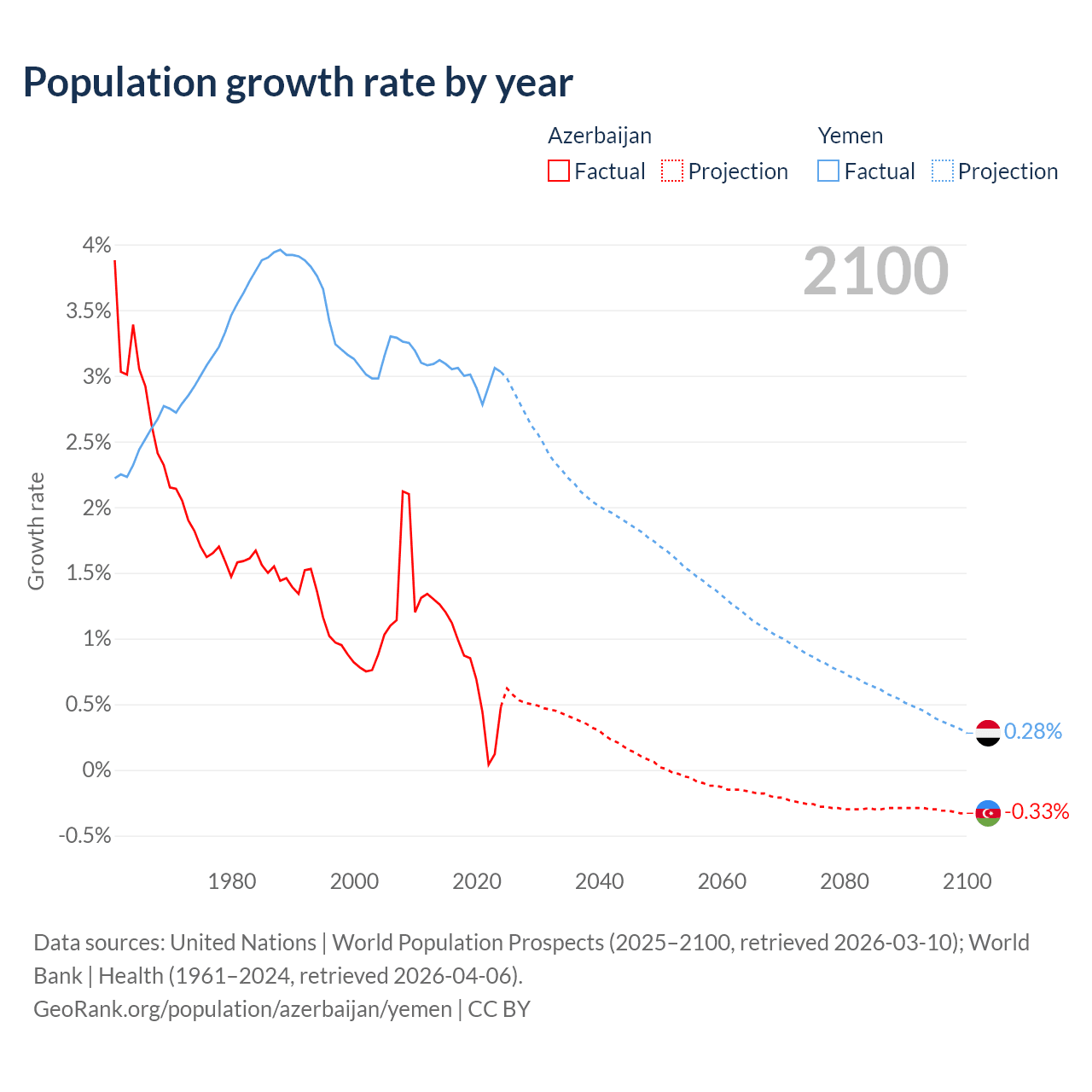 - For the last 10 years, Azerbaijan has had an average growth rate of +0.73% per year vs +3% in Yemen.