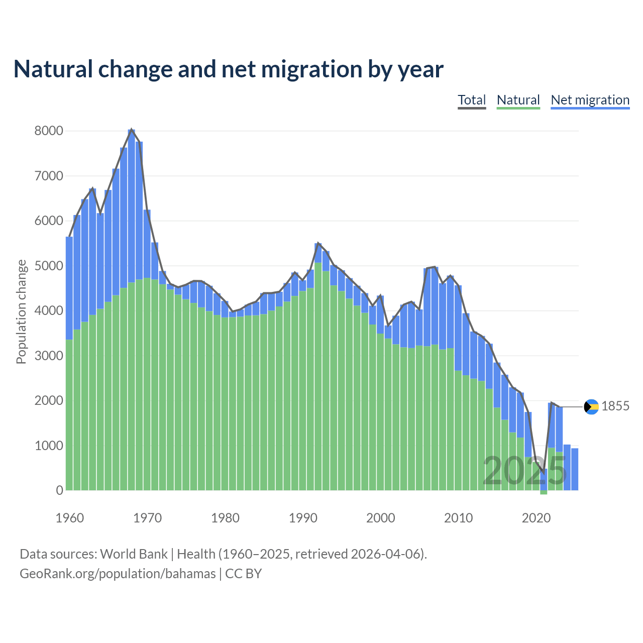 Over the last 10 years, 56.9% of the population change in the Bahamas is from natural causes (a gain of 11,209 people) and 43.1% is from migration (a gain of 8,495 people).