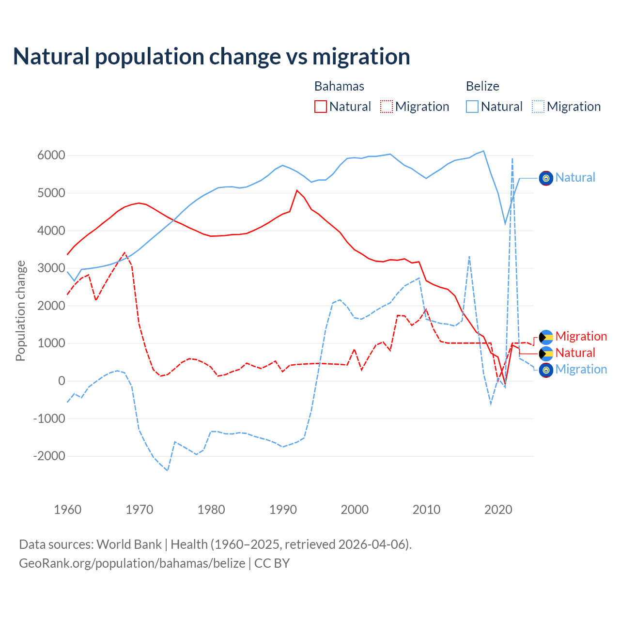 Over the last 10 years, 56.9% of the population change in the Bahamas is from natural causes (a gain of 11,209 people) and 43.1% is from migration (a gain of 8,495 people). In Belize 79.6% is from natural causes (a gain of 54,754 people) and 20.4% is from migration (a gain of 14,073 people).