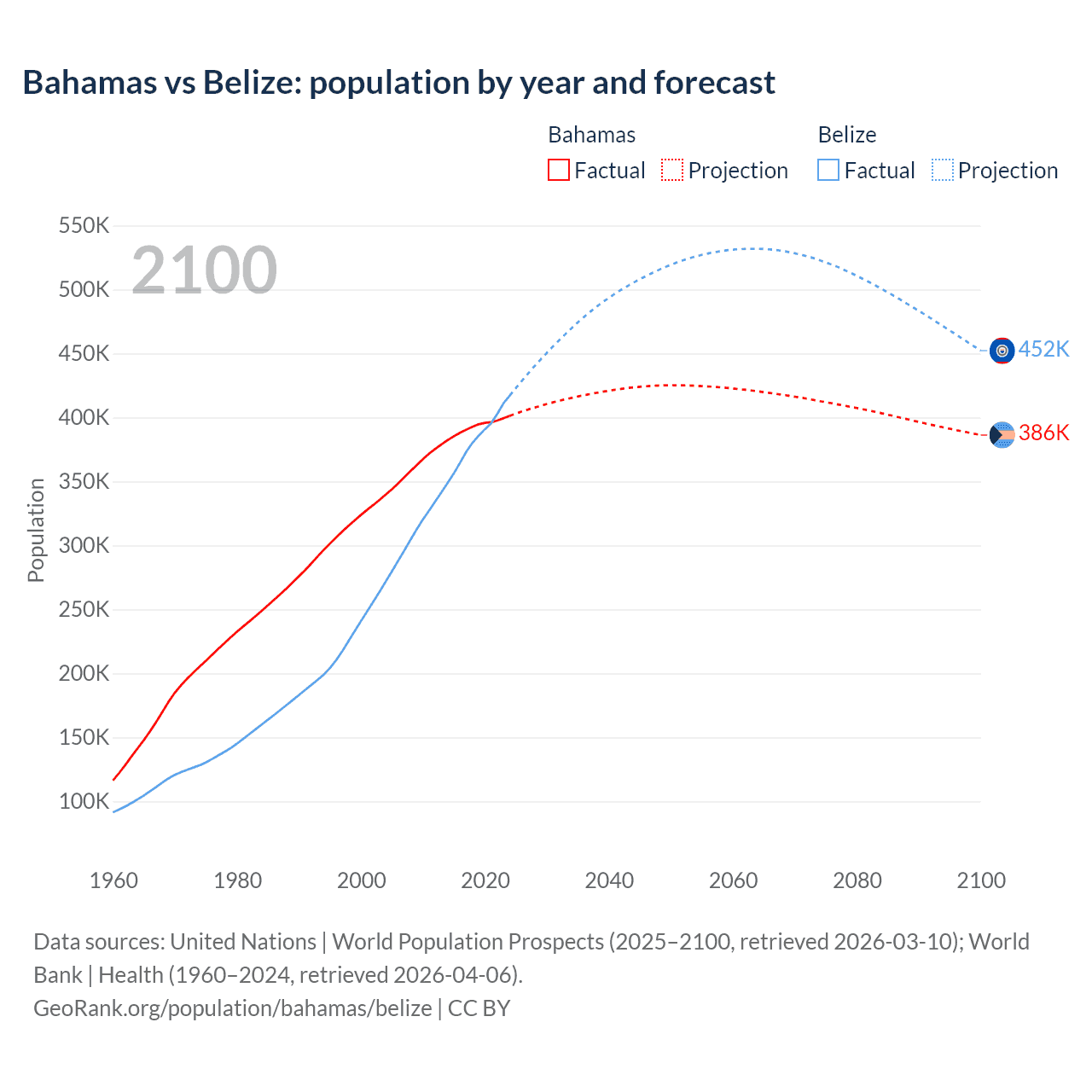 The latest officially reported population of the Bahamas was 401,283 in 2024 vs 417,072 people in Belize in 2024. In 2026, based on the adjusted UN estimation, the current Bahamas' population is 405,203 people compared to 430,409 in Belize.
