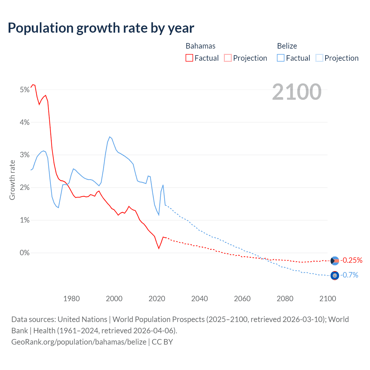 - For the last 10 years, the Bahamas has had an average growth rate of +0.52% per year vs +1.83% in Belize.