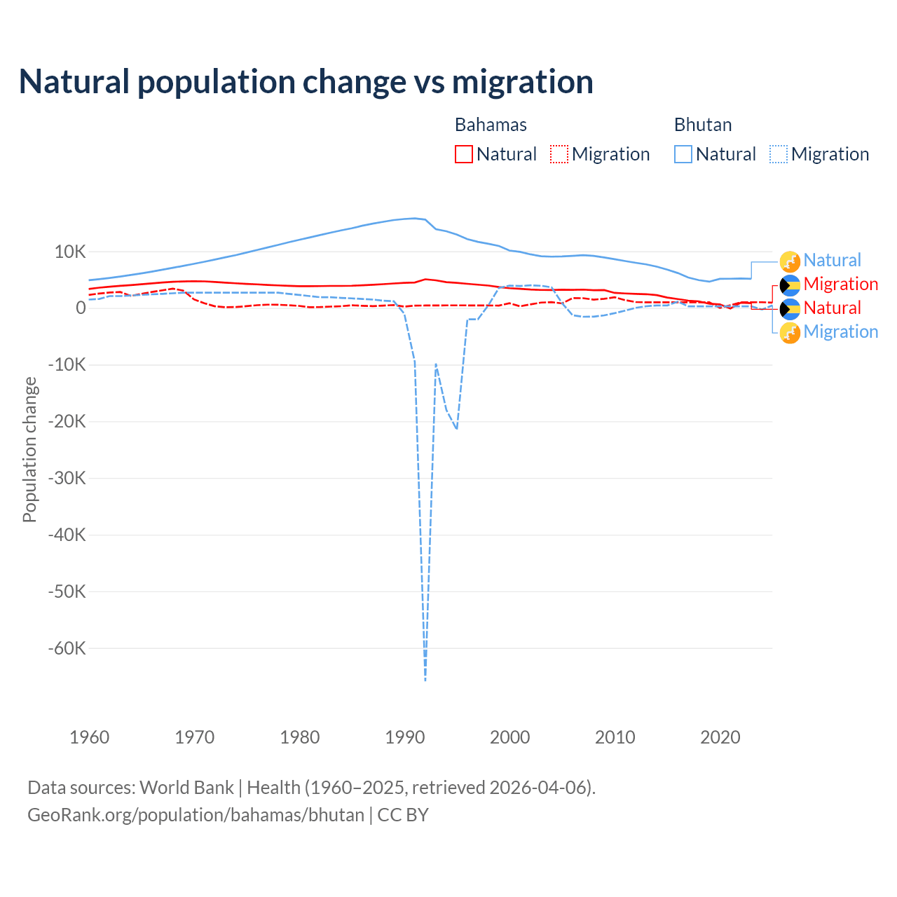Over the last 10 years, 56.9% of the population change in the Bahamas is from natural causes (a gain of 11,209 people) and 43.1% is from migration (a gain of 8,495 people). In Bhutan 93.3% is from natural causes (a gain of 55,796 people) and 6.74% is from migration (a gain of 4,035 people).