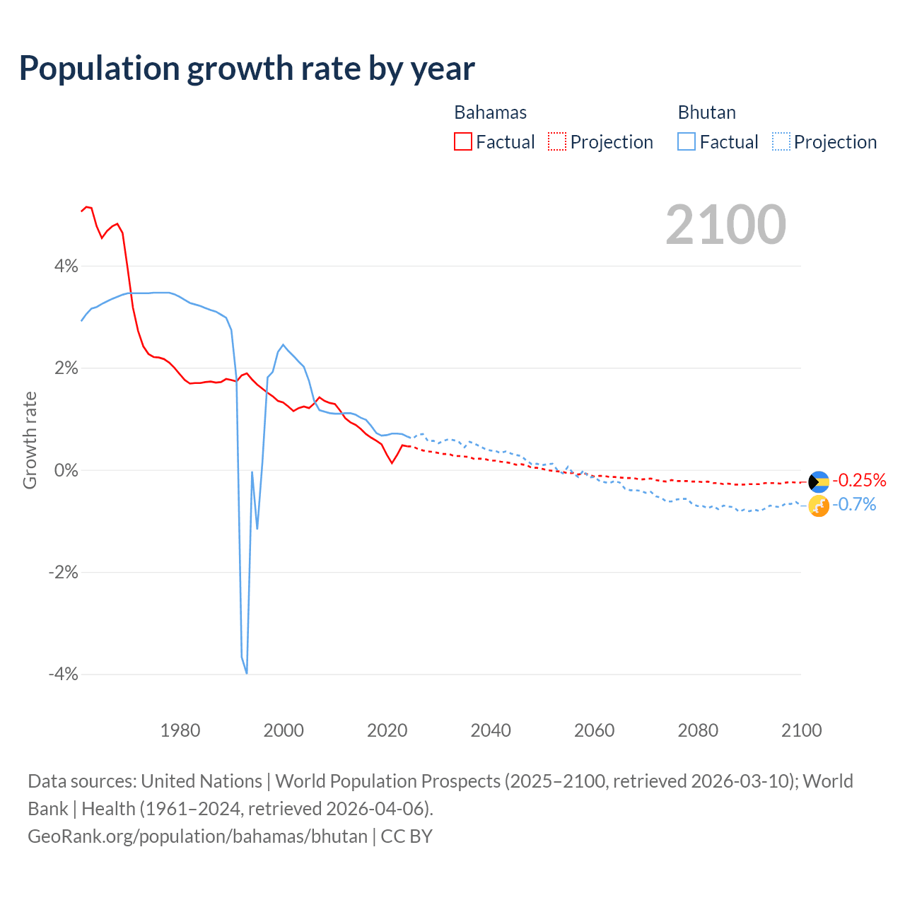 - For the last 10 years, the Bahamas has had an average growth rate of +0.52% per year vs +0.8% in Bhutan.