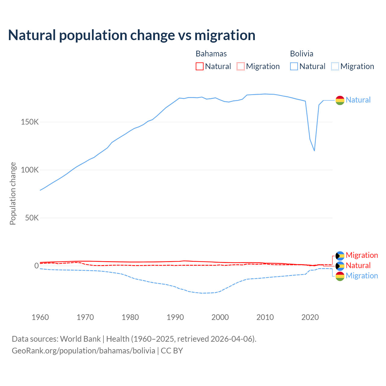 Over the last 10 years, 56.9% of the population change in the Bahamas is from natural causes (a gain of 11,209 people) and 43.1% is from migration (a gain of 8,495 people). In Bolivia 95.6% is from natural causes (a gain of 1,637,833 people) and 4.37% is from migration (a loss of 74,903 people).