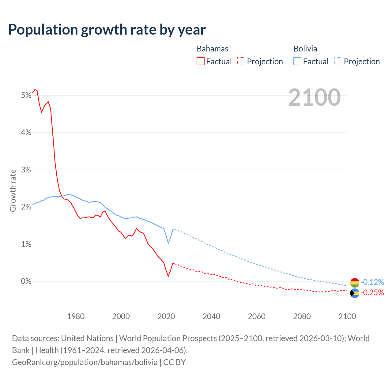- For the last 10 years, the Bahamas has had an average growth rate of +0.52% per year vs +1.37% in Bolivia.