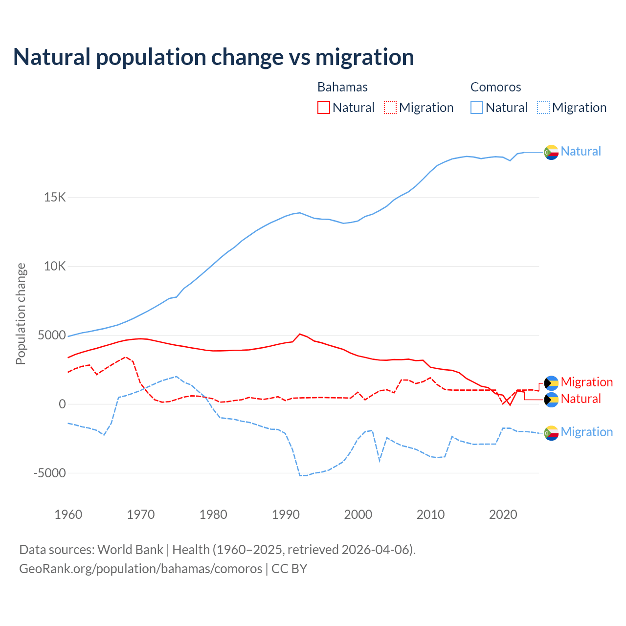 Over the last 10 years, 56.9% of the population change in the Bahamas is from natural causes (a gain of 11,209 people) and 43.1% is from migration (a gain of 8,495 people). In Comoros 87.9% is from natural causes (a gain of 179,319 people) and 12.1% is from migration (a loss of 24,709 people).