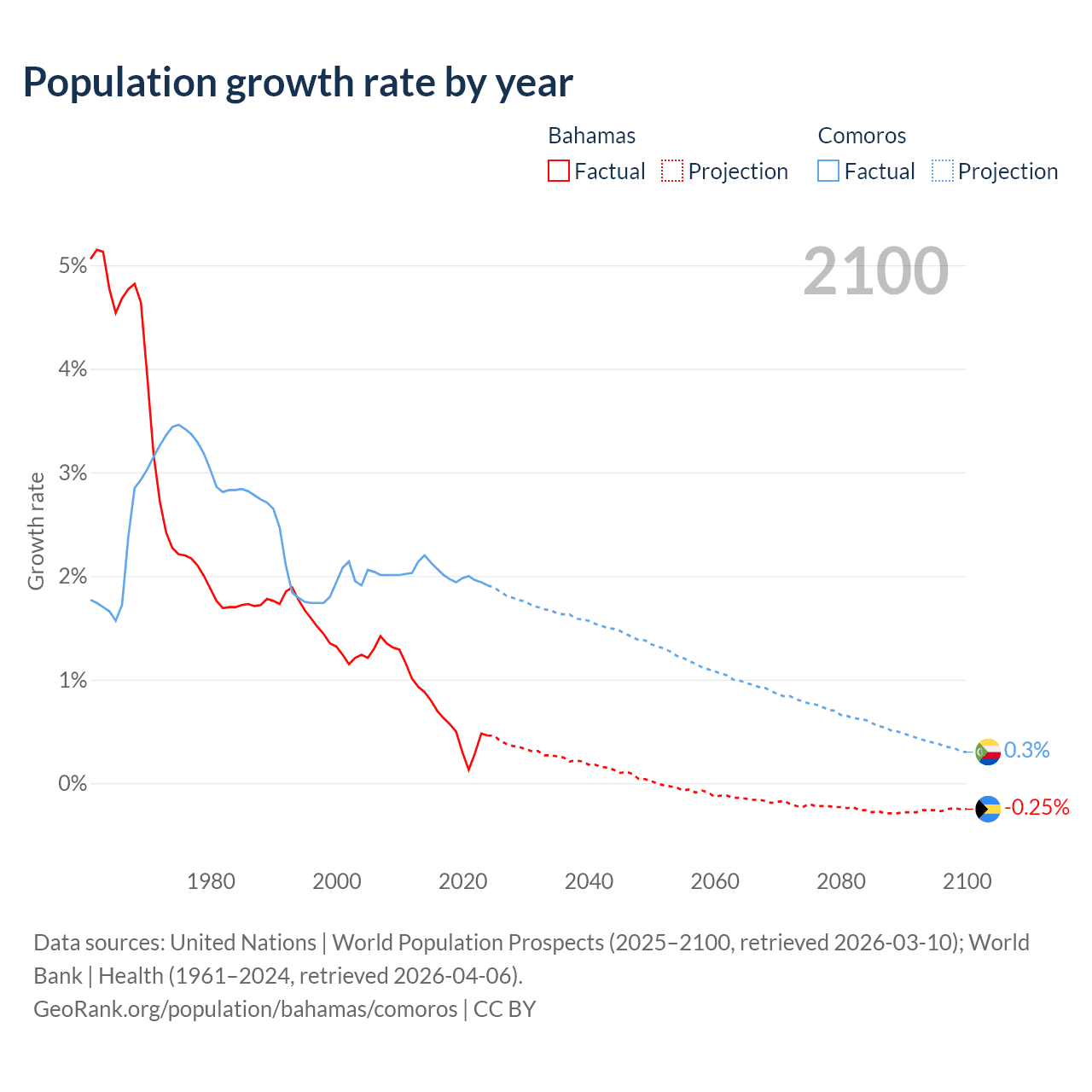 - For the last 10 years, the Bahamas has had an average growth rate of +0.52% per year vs +2.01% in Comoros.