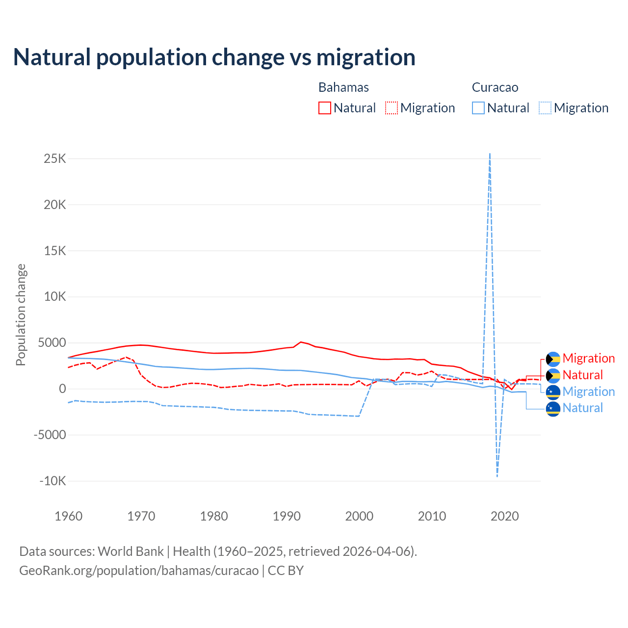 Over the last 10 years, 56.9% of the population change in the Bahamas is from natural causes (a gain of 11,209 people) and 43.1% is from migration (a gain of 8,495 people). In Curacao 3.72% is from natural causes (a gain of 834 people) and 96.3% is from migration (a gain of 21,615 people).