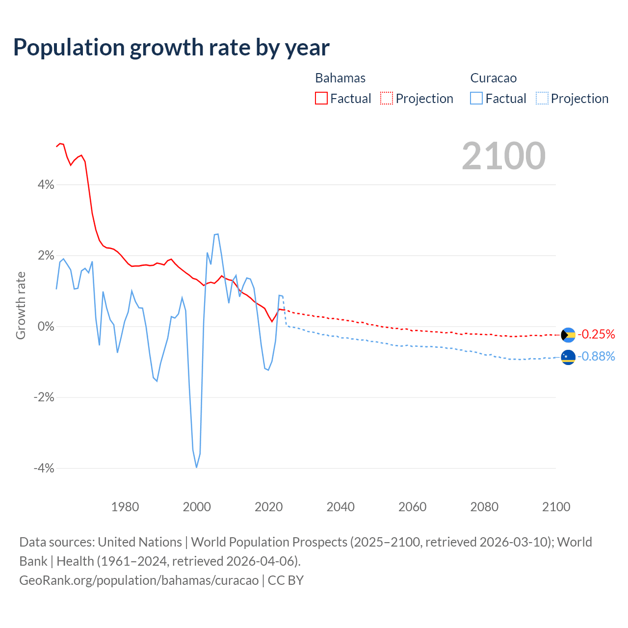 - For the last 10 years, the Bahamas has had an average growth rate of +0.52% per year vs +0.13% in Curacao.