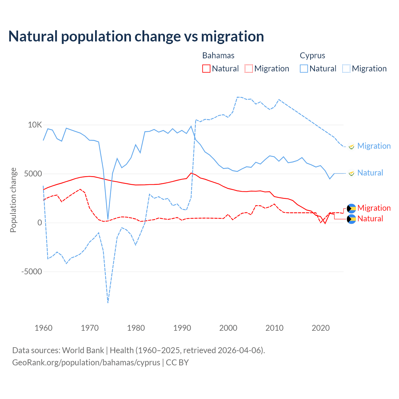 Over the last 10 years, 56.9% of the population change in the Bahamas is from natural causes (a gain of 11,209 people) and 43.1% is from migration (a gain of 8,495 people). In Cyprus 36.2% is from natural causes (a gain of 57,464 people) and 63.8% is from migration (a gain of 101,458 people).
