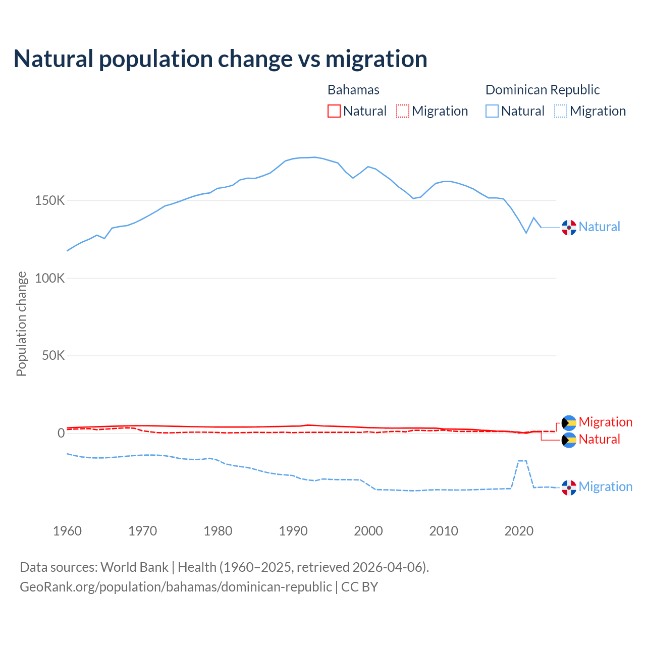 Over the last 10 years, 56.9% of the population change in the Bahamas is from natural causes (a gain of 11,209 people) and 43.1% is from migration (a gain of 8,495 people). In the Dominican Republic 81.8% is from natural causes (a gain of 1,447,764 people) and 18.2% is from migration (a loss of 322,919 people).