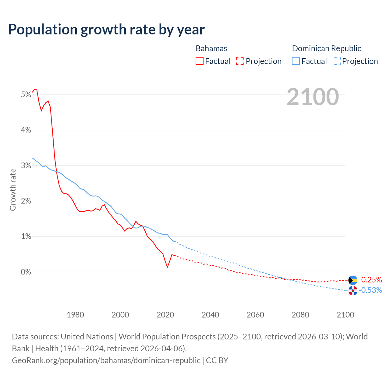 - For the last 10 years, the Bahamas has had an average growth rate of +0.52% per year vs +1.04% in the Dominican Republic.