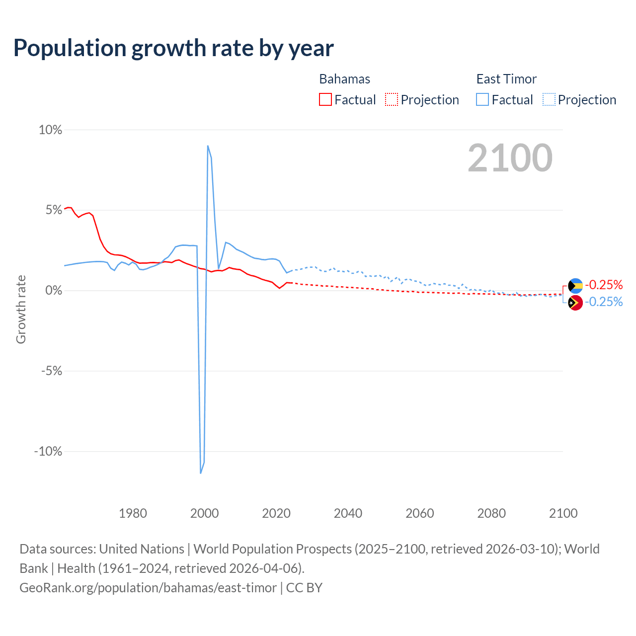- For the last 10 years, the Bahamas has had an average growth rate of +0.52% per year vs +1.74% in East Timor.