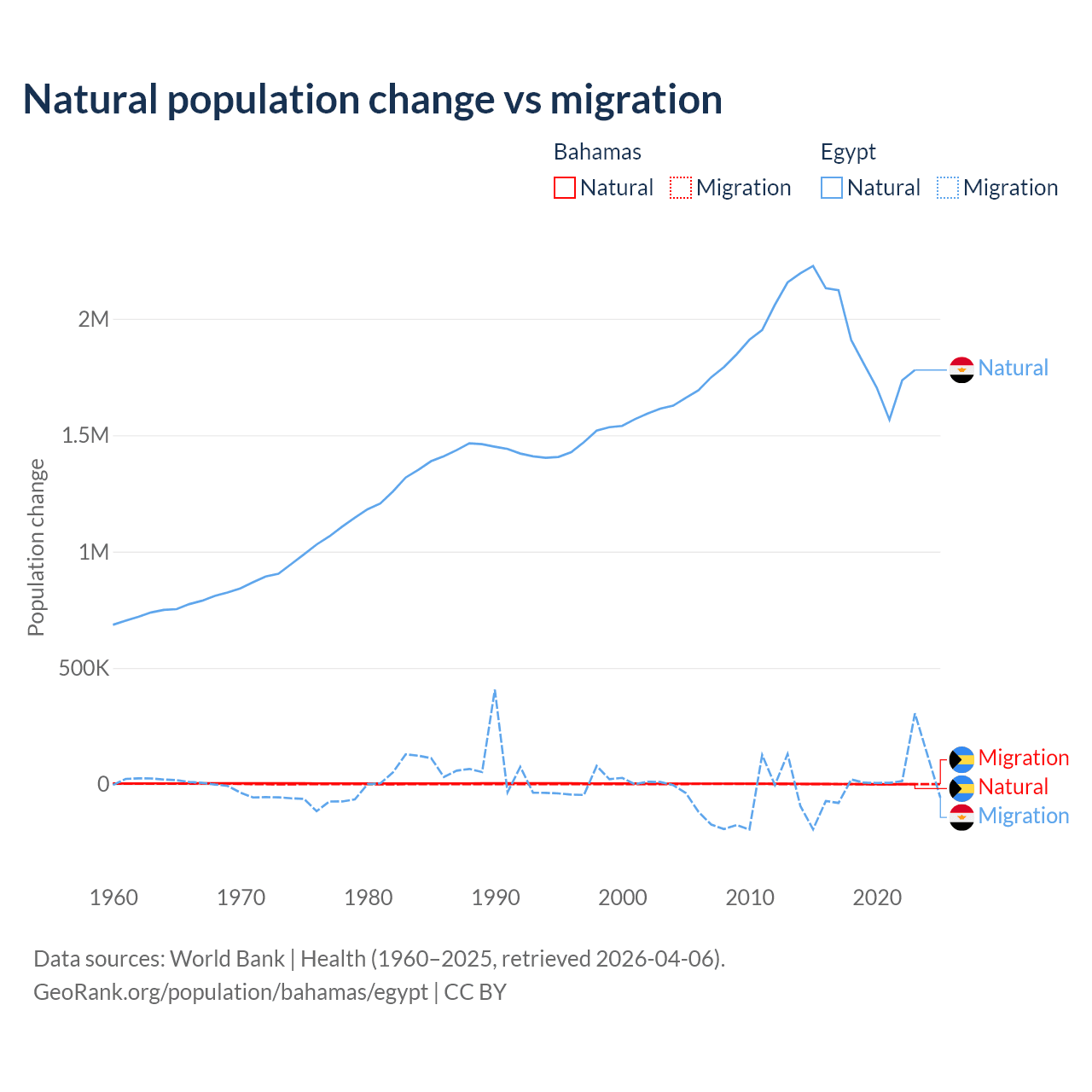 Over the last 10 years, 56.9% of the population change in the Bahamas is from natural causes (a gain of 11,209 people) and 43.1% is from migration (a gain of 8,495 people). In Egypt 99.6% is from natural causes (a gain of 19,180,073 people) and 0.41% is from migration (a loss of 78,975 people).