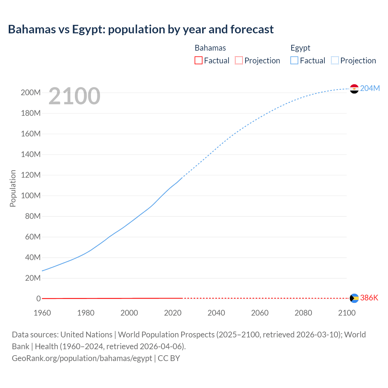 The latest officially reported population of the Bahamas was 401,283 in 2024 vs 116,538,258 people in Egypt in 2024. In 2026, based on the adjusted UN estimation, the current Bahamas' population is 405,203 people compared to 120,697,176 in Egypt.