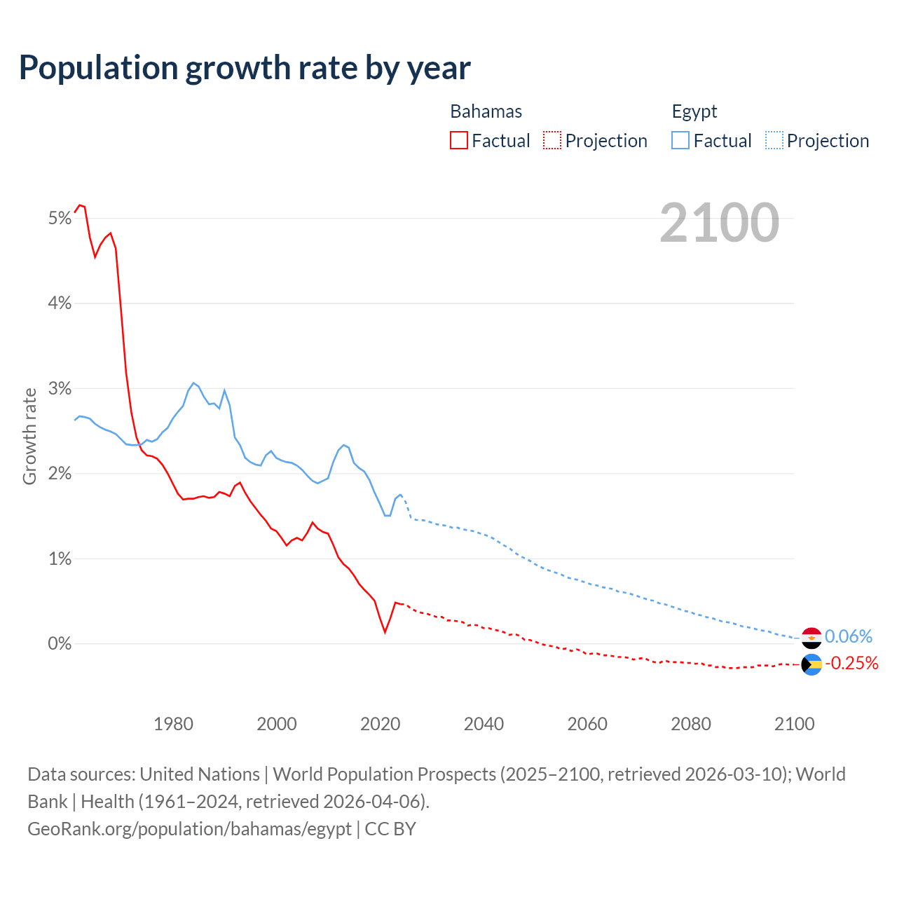 - For the last 10 years, the Bahamas has had an average growth rate of +0.52% per year vs +1.84% in Egypt.