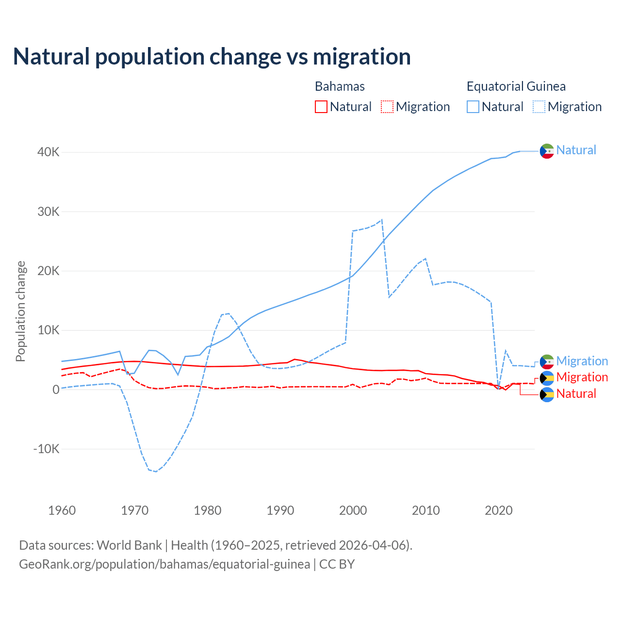 Over the last 10 years, 56.9% of the population change in the Bahamas is from natural causes (a gain of 11,209 people) and 43.1% is from migration (a gain of 8,495 people). In Equatorial Guinea 77% is from natural causes (a gain of 382,745 people) and 23% is from migration (a gain of 114,024 people).