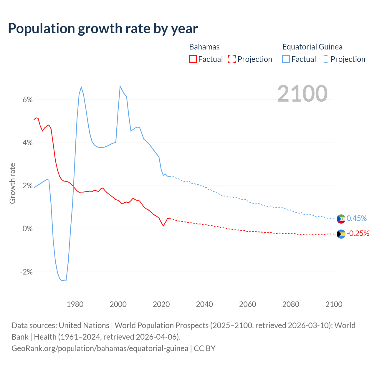 - For the last 10 years, the Bahamas has had an average growth rate of +0.52% per year vs +3.15% in Equatorial Guinea.