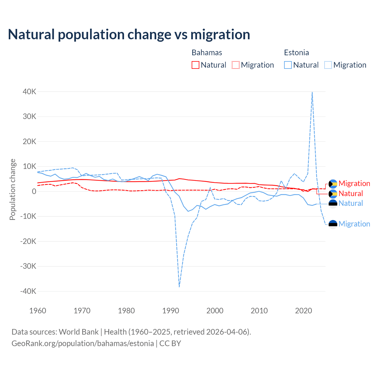 Over the last 10 years, 56.9% of the population change in the Bahamas is from natural causes (a gain of 11,209 people) and 43.1% is from migration (a gain of 8,495 people). In Estonia 26.1% is from natural causes (a loss of 27,683 people) and 73.9% is from migration (a gain of 78,553 people).