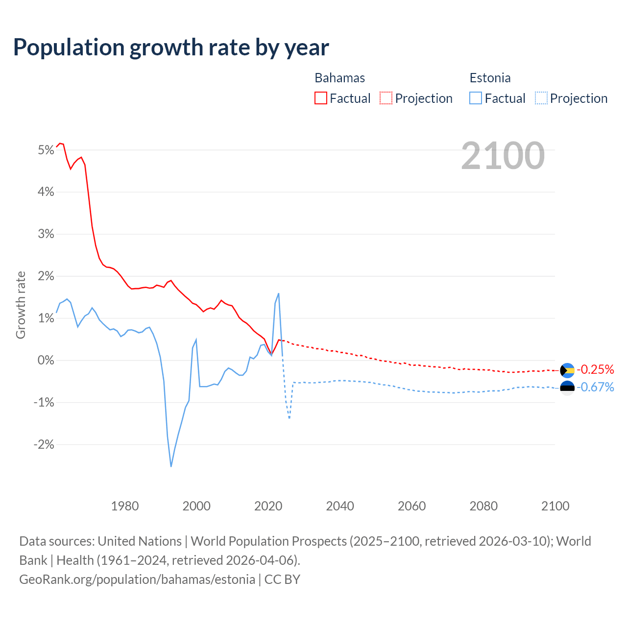 - For the last 10 years, the Bahamas has had an average growth rate of +0.52% per year vs +0.37% in Estonia.