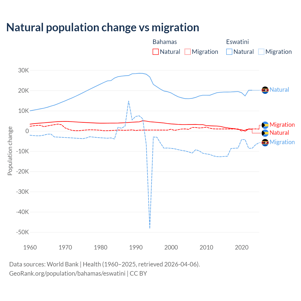 Over the last 10 years, 56.9% of the population change in the Bahamas is from natural causes (a gain of 11,209 people) and 43.1% is from migration (a gain of 8,495 people). In Eswatini 68.3% is from natural causes (a gain of 192,206 people) and 31.7% is from migration (a loss of 89,012 people).