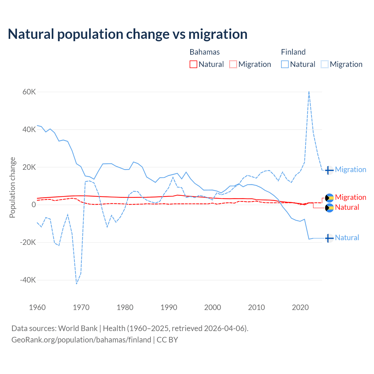 Over the last 10 years, 56.9% of the population change in the Bahamas is from natural causes (a gain of 11,209 people) and 43.1% is from migration (a gain of 8,495 people). In Finland 22.5% is from natural causes (a loss of 65,560 people) and 77.5% is from migration (a gain of 225,237 people).