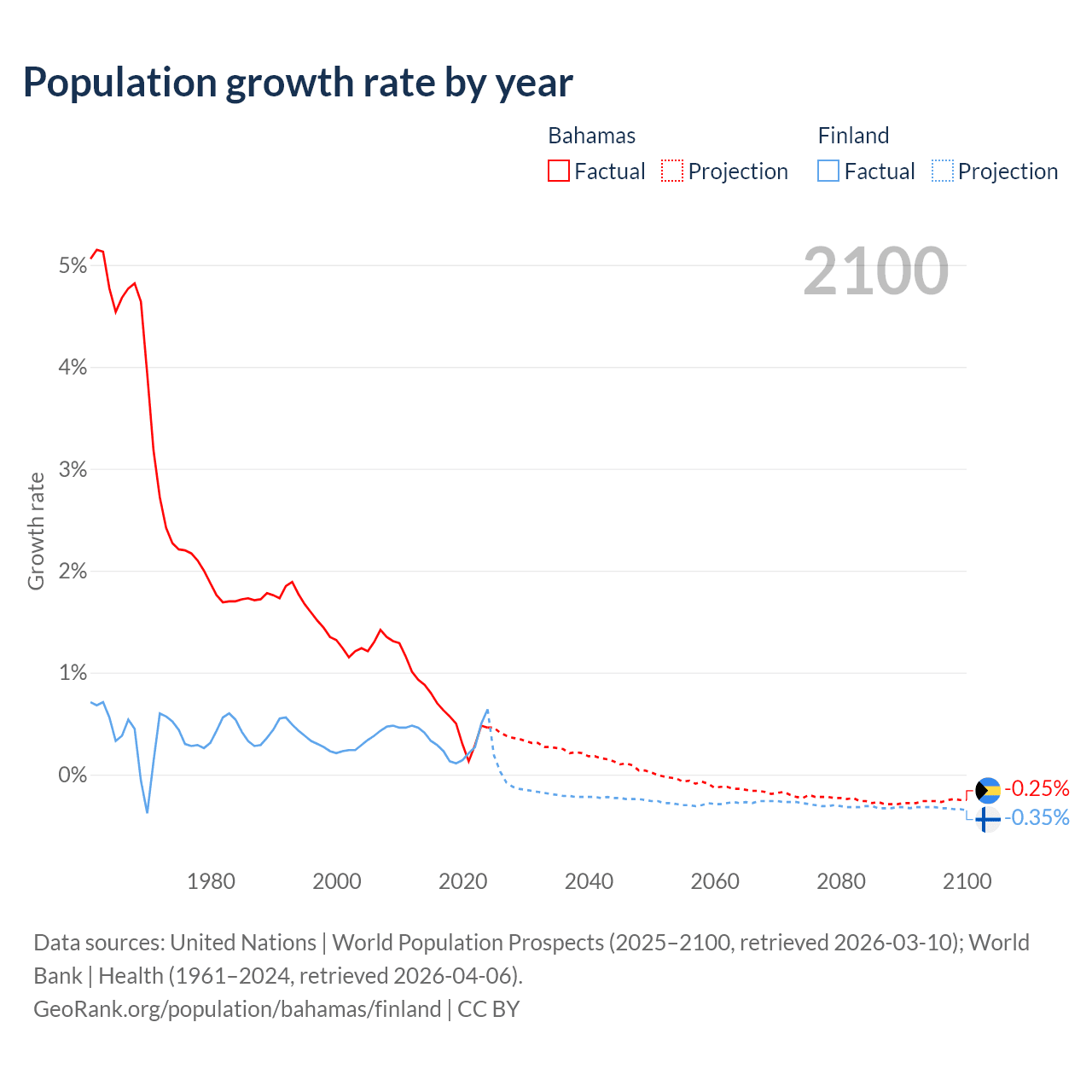 - For the last 10 years, the Bahamas has had an average growth rate of +0.52% per year vs +0.3% in Finland.