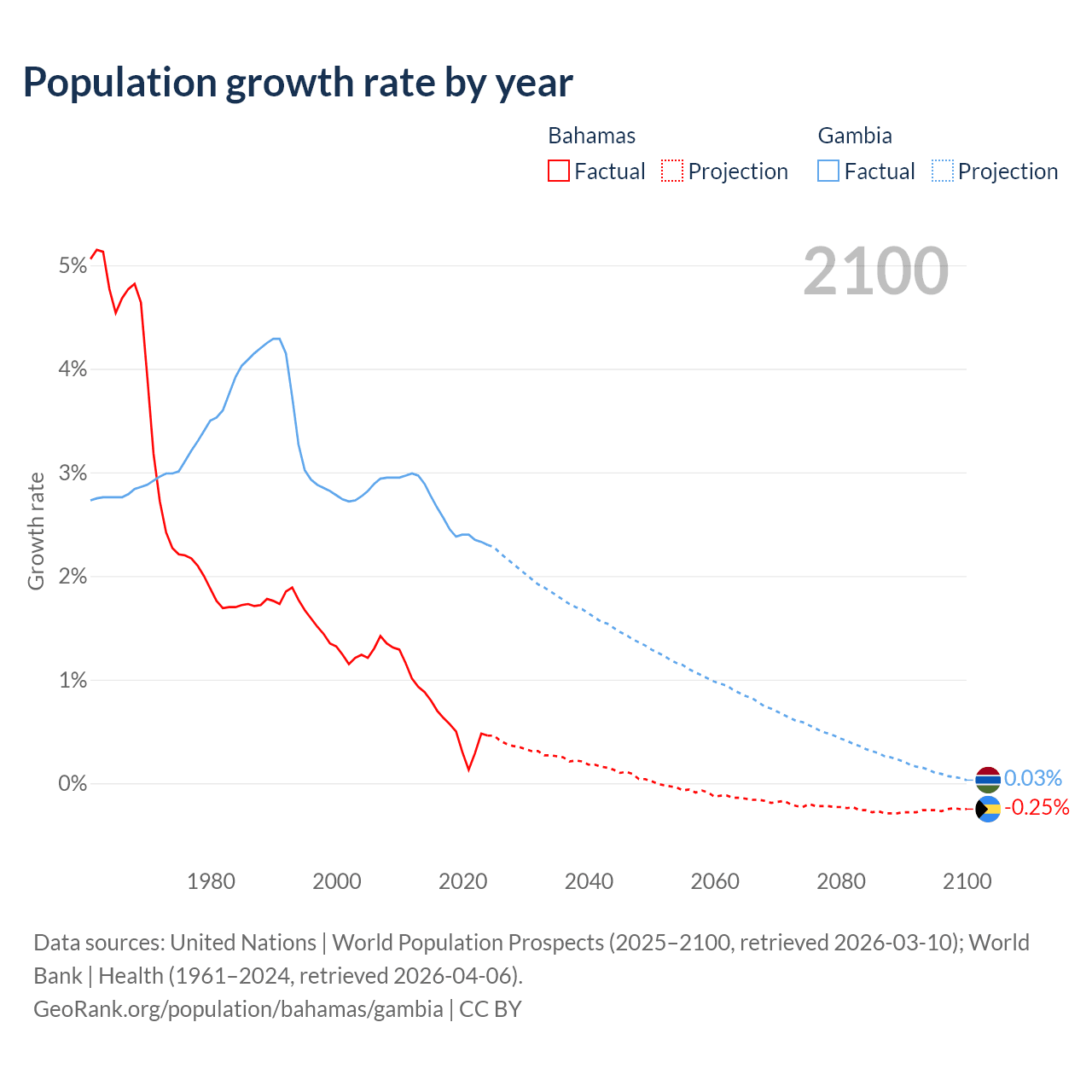 - For the last 10 years, the Bahamas has had an average growth rate of +0.52% per year vs +2.5% in the Gambia.