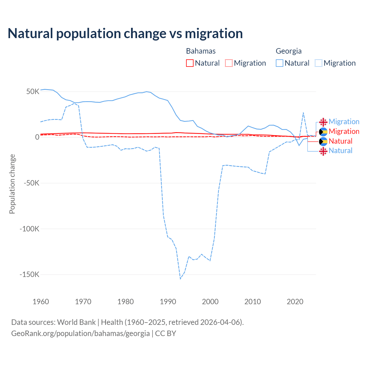 Over the last 10 years, 56.9% of the population change in the Bahamas is from natural causes (a gain of 11,209 people) and 43.1% is from migration (a gain of 8,495 people). In Georgia 57.7% is from natural causes (a gain of 47,646 people) and 42.3% is from migration (a loss of 34,907 people).