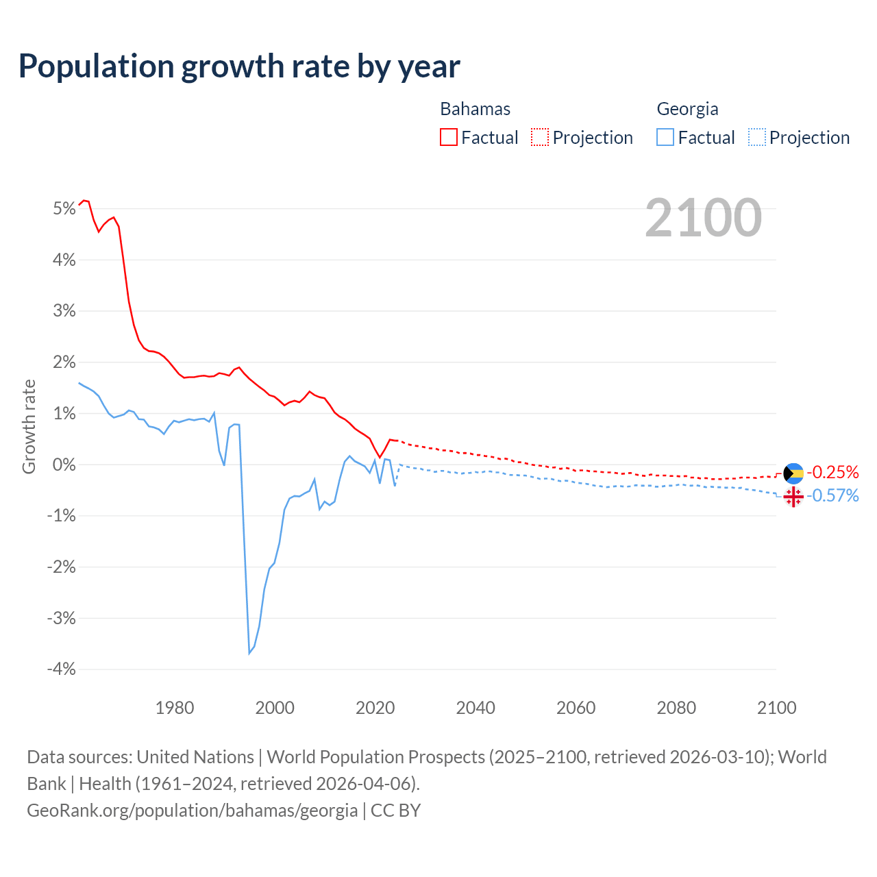 - For the last 10 years, the Bahamas has had an average growth rate of +0.52% per year vs -0.04% in Georgia.