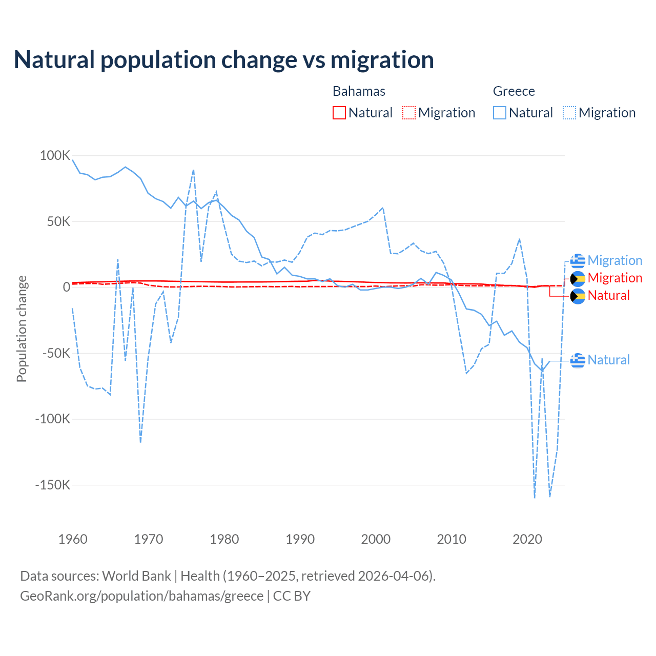 Over the last 10 years, 56.9% of the population change in the Bahamas is from natural causes (a gain of 11,209 people) and 43.1% is from migration (a gain of 8,495 people). In Greece 51.9% is from natural causes (a loss of 411,426 people) and 48.1% is from migration (a loss of 381,824 people).
