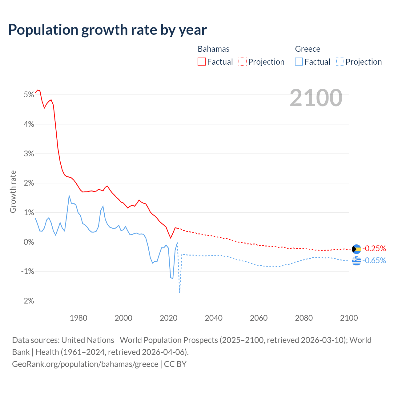 - For the last 10 years, the Bahamas has had an average growth rate of +0.52% per year vs -0.47% in Greece.