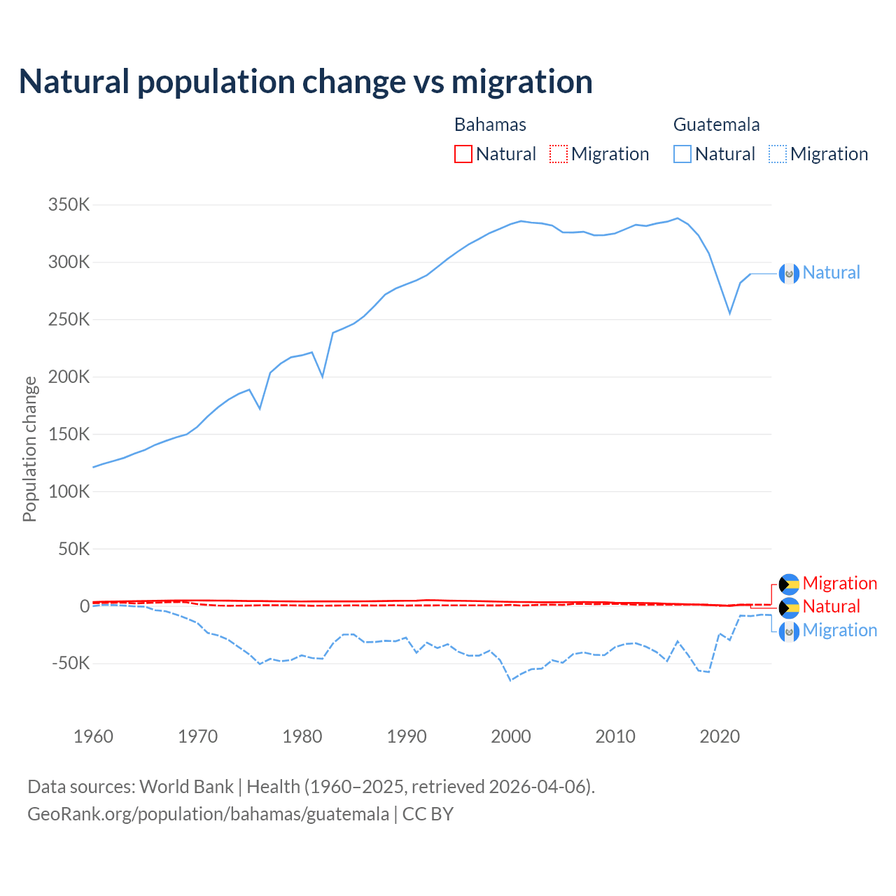 Over the last 10 years, 56.9% of the population change in the Bahamas is from natural causes (a gain of 11,209 people) and 43.1% is from migration (a gain of 8,495 people). In Guatemala 89.8% is from natural causes (a gain of 3,077,847 people) and 10.2% is from migration (a loss of 347,818 people).