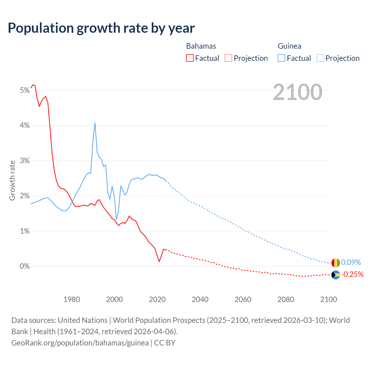 - For the last 10 years, the Bahamas has had an average growth rate of +0.52% per year vs +2.54% in Guinea.