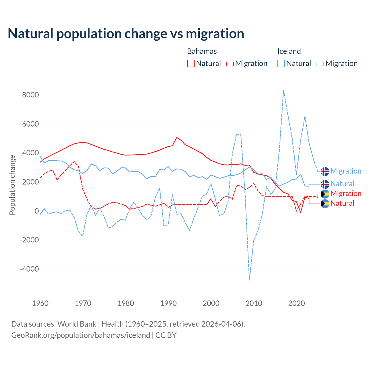 Over the last 10 years, 56.9% of the population change in the Bahamas is from natural causes (a gain of 11,209 people) and 43.1% is from migration (a gain of 8,495 people). In Iceland 30.7% is from natural causes (a gain of 20,128 people) and 69.3% is from migration (a gain of 45,356 people).