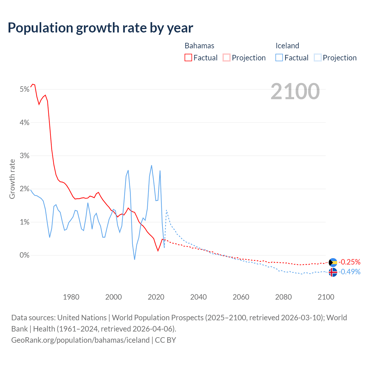 - For the last 10 years, the Bahamas has had an average growth rate of +0.52% per year vs +1.63% in Iceland.