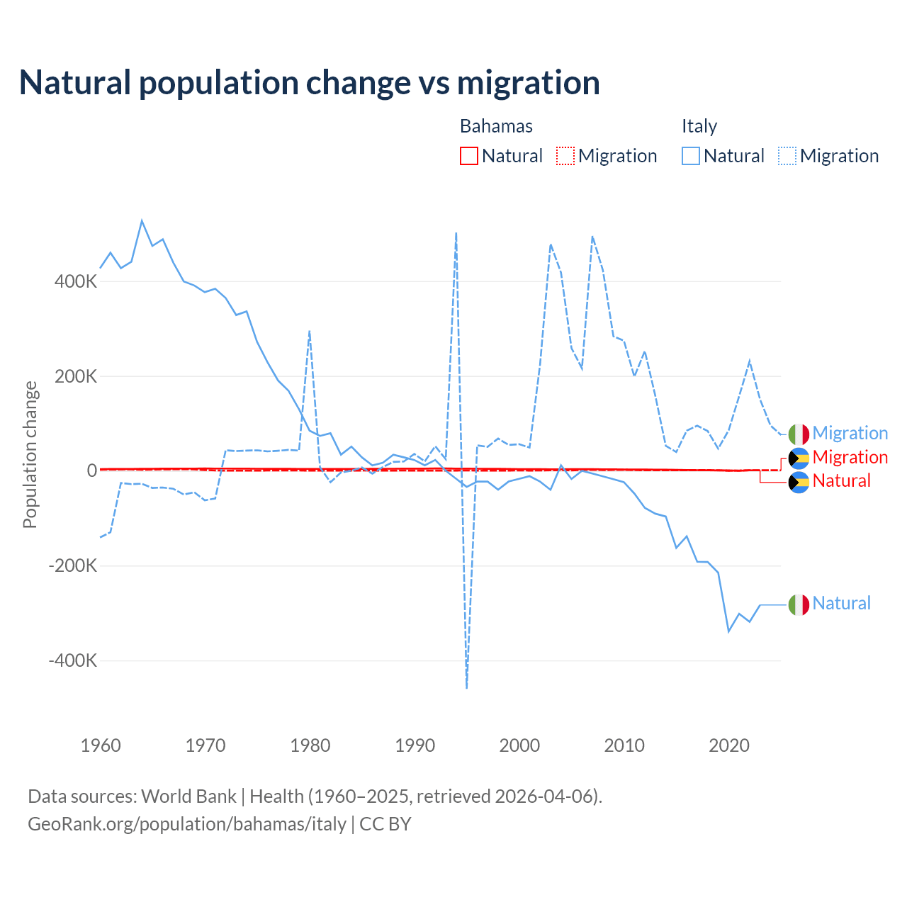 Over the last 10 years, 56.9% of the population change in the Bahamas is from natural causes (a gain of 11,209 people) and 43.1% is from migration (a gain of 8,495 people). In Italy 68.6% is from natural causes (a loss of 2,239,084 people) and 31.4% is from migration (a gain of 1,026,128 people).
