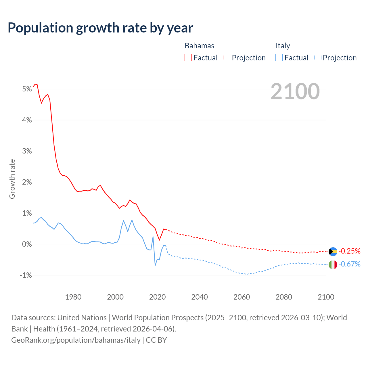 - For the last 10 years, the Bahamas has had an average growth rate of +0.52% per year vs -0.21% in Italy.