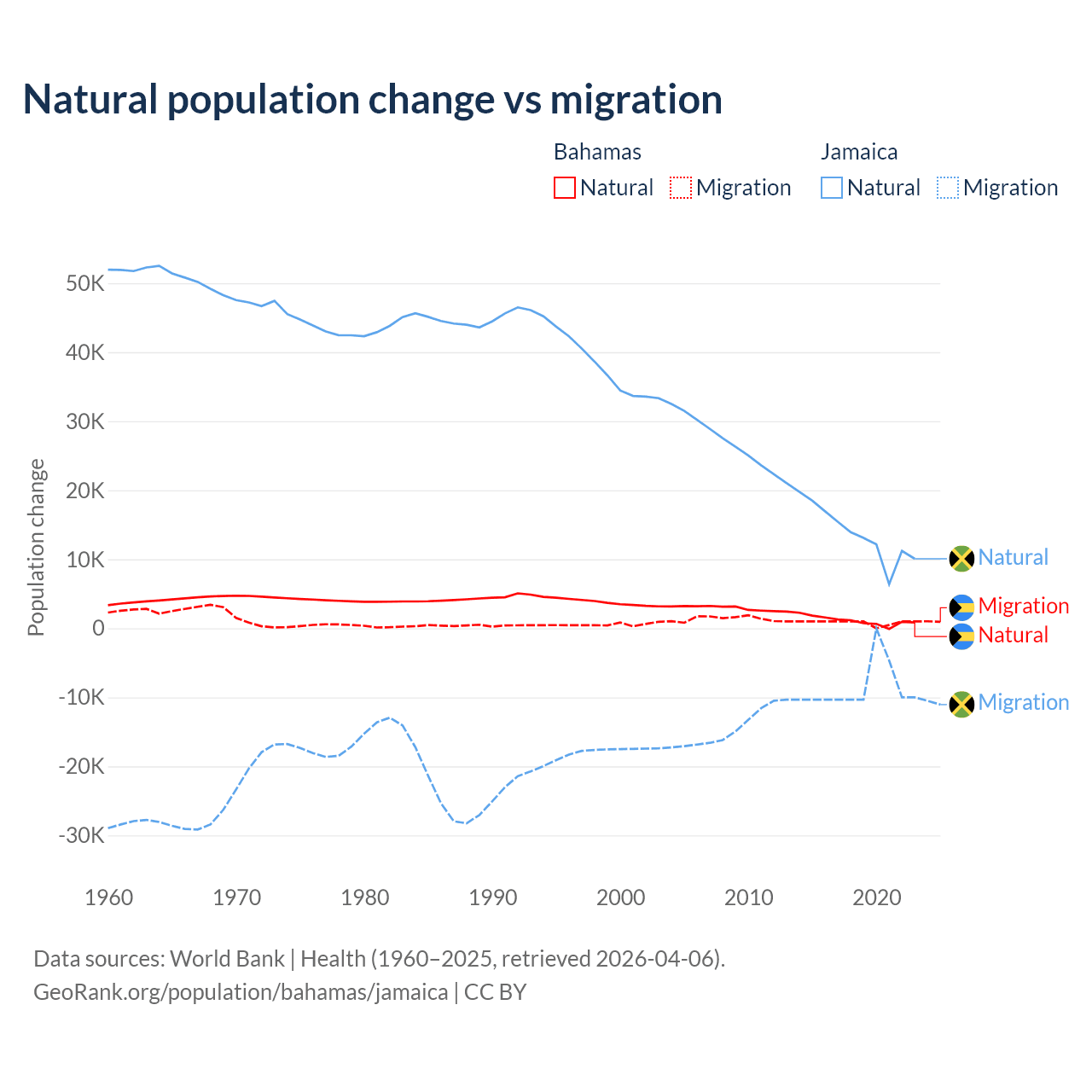 Over the last 10 years, 56.9% of the population change in the Bahamas is from natural causes (a gain of 11,209 people) and 43.1% is from migration (a gain of 8,495 people). In Jamaica 61.3% is from natural causes (a gain of 137,465 people) and 38.7% is from migration (a loss of 86,681 people).